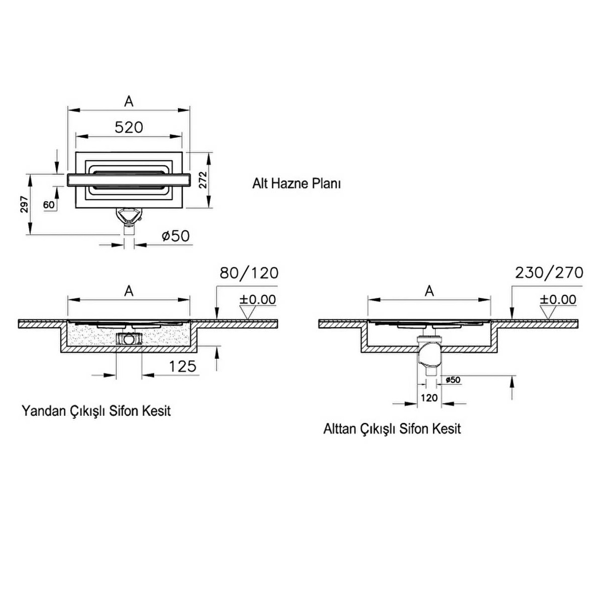 Canal / rigola de dus 100 080 cupru evacuare verticala s