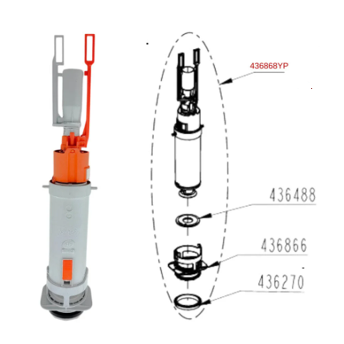 Piese incluse: Setul este livrat complet si contine, pe langa mecanismul principal 436868YP, si referintele tehnice necesare montajului: garnitura de etansare 436488, suportul de fixare 436866 si inelul de baza 436270.