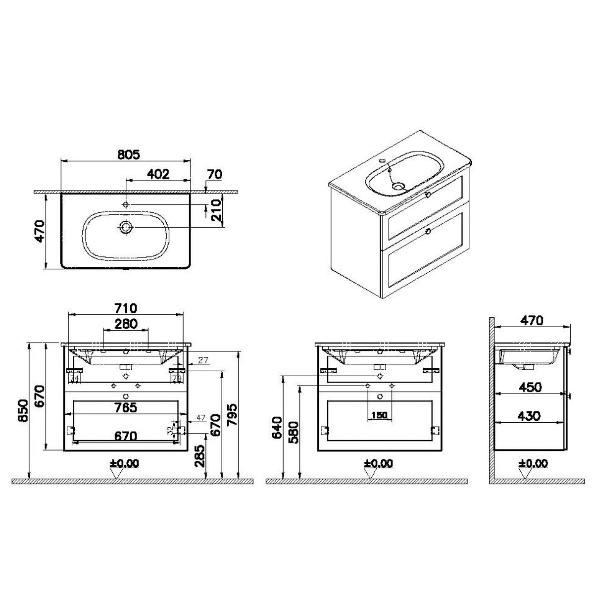 Descriere Calculată 1: Root Classic, Vanity unit, 80 cm,two drawers