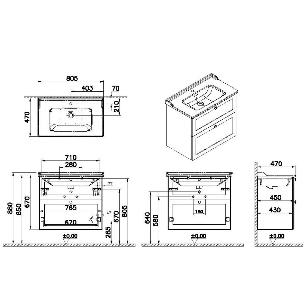 Descriere Calculată 1: Root Classic, Vanity unit, 80 cm,two drawers