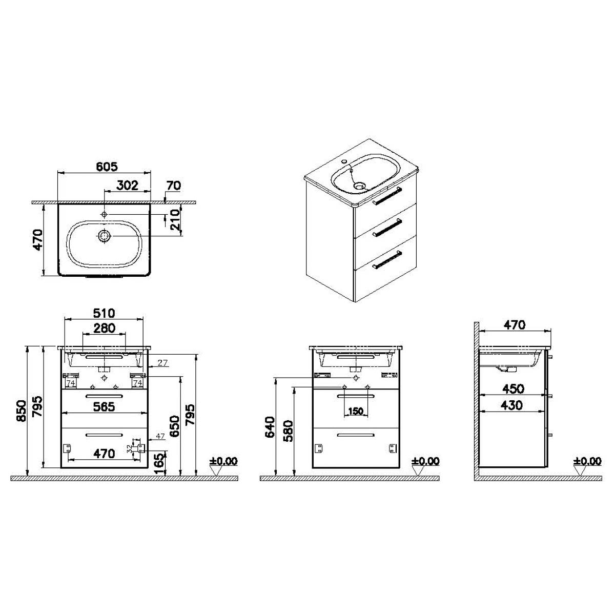 Descriere Calculată 1: Root, Vanity unit, 60 cm,three drawers