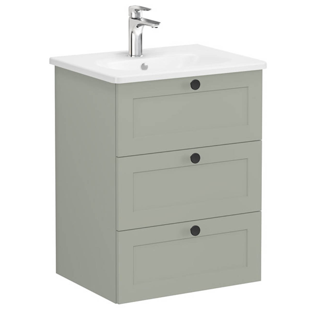Root classic washbasin unit, with three drawers, 60cm, matt retro green, with rounded washbasin