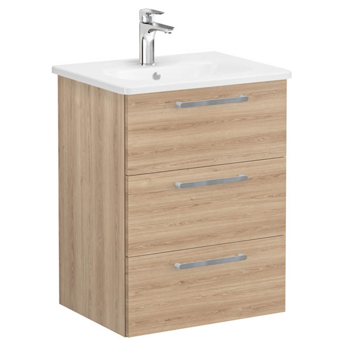 Root washbasin unit, with three drawers, 60cm, natural oak, with rounded washbasin