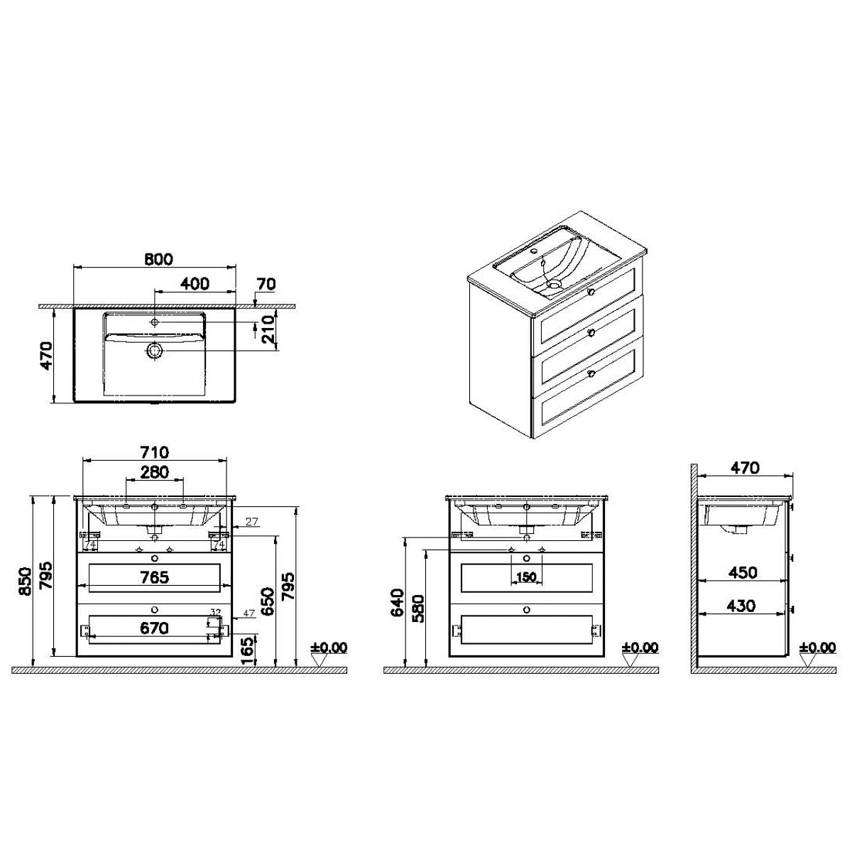 Descriere Calculată 1: Root Classic, Vanity unit, 80 cm,three drawers