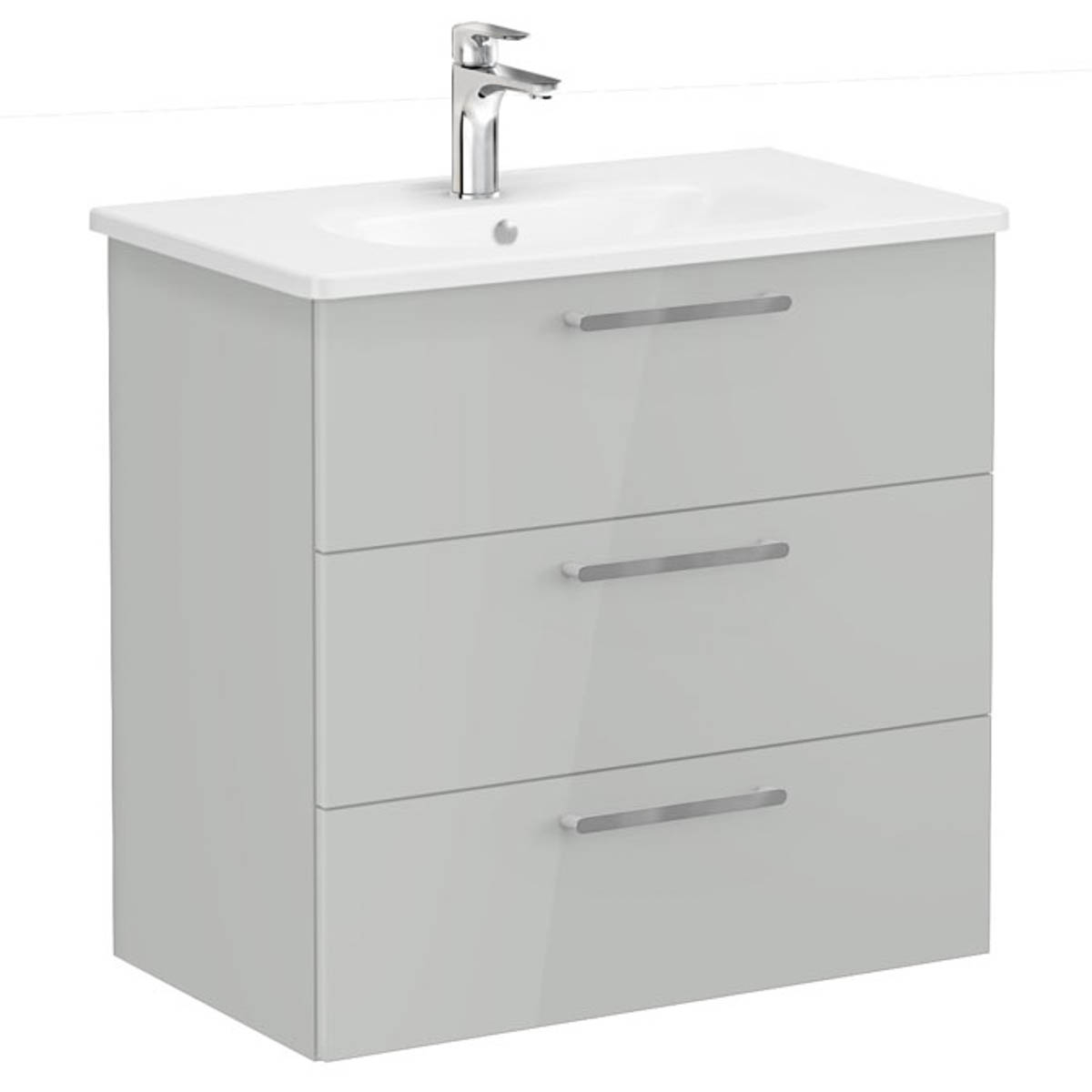 Root washbasin unit, with three drawers, 80cm, high gloss pearl grey, with rounded washbasin