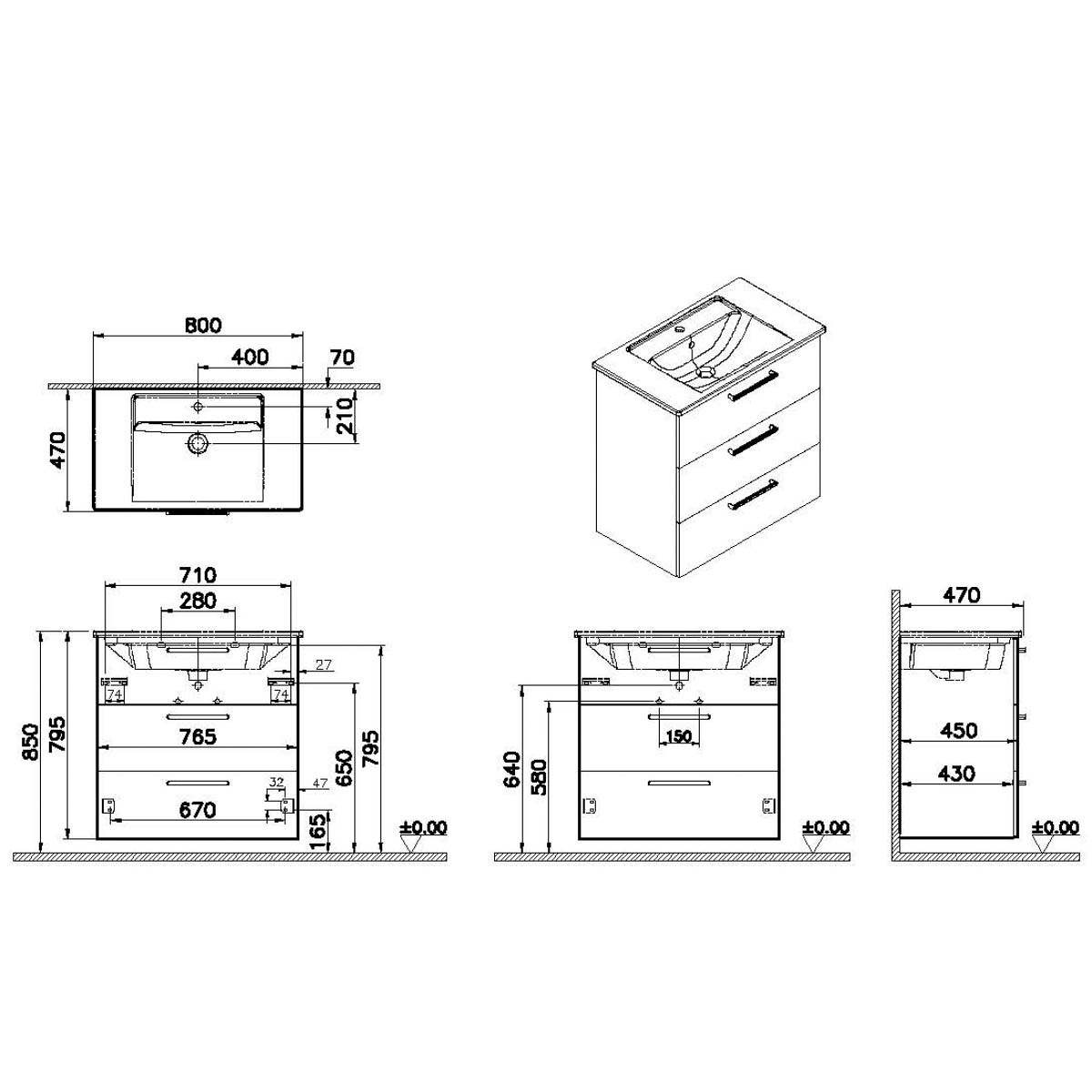 Descriere Calculată 1: Root, Vanity unit, 80 cm,three drawers