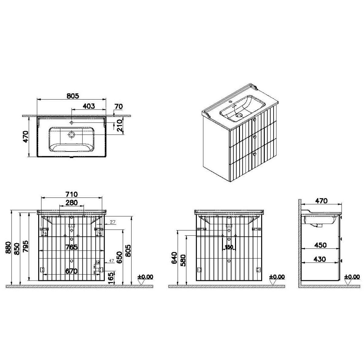 Descriere Calculată 1: Root Groove, Vanity unit, 80 cm,three drawers