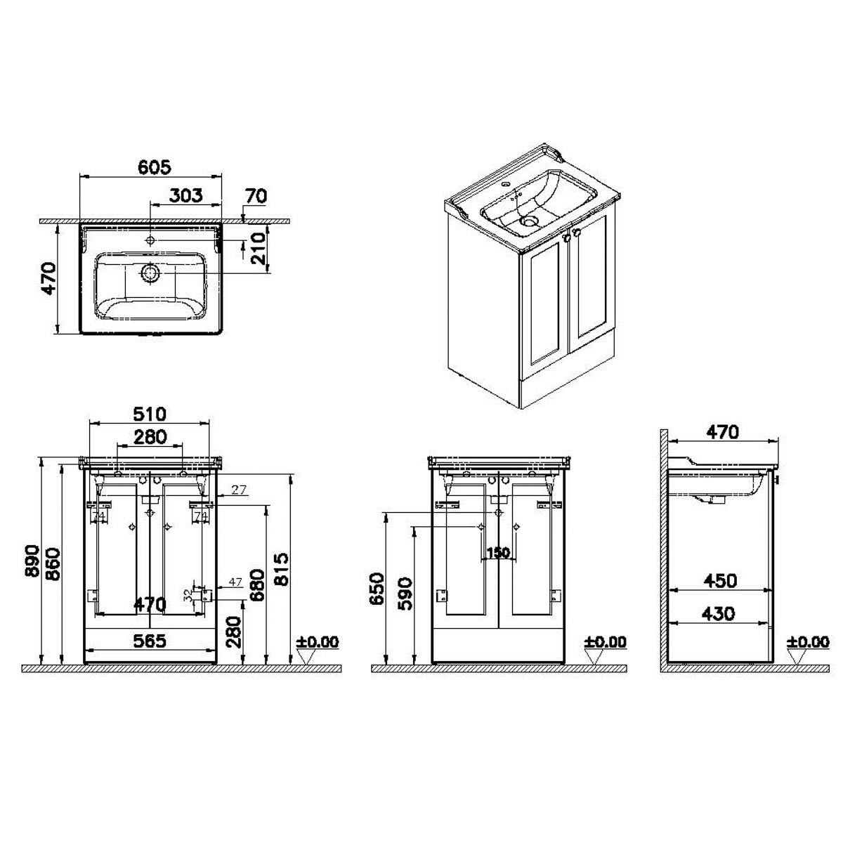 Unitate de baza lavoar baie, cu usi 60cm pe pardoseala, mat gri deschis, cu classical lavoar / chiuveta baie | 68765 Matte Light Grey, Colectia Root Classic Vitra